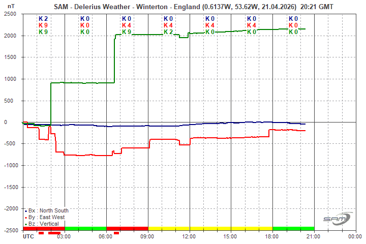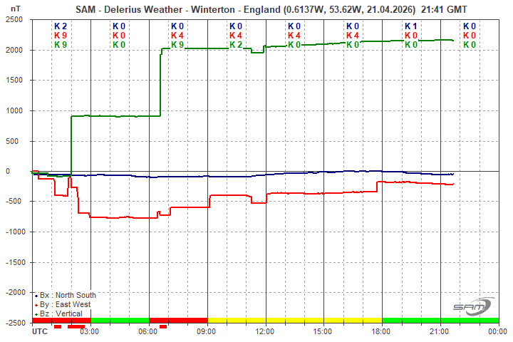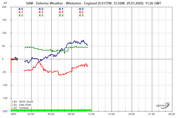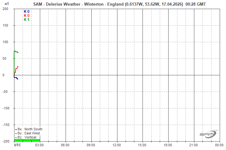 Below is the live magnetometer trend from the sensors located in my back garden! When a geomagnetic storm starts - the magnetometer responds with spikes indicating unrest. As the storm strengthens the magnetometer spikes better... once the trend falls significantly in these lower latitudes there is a chance that we will see the aurora low in the Northern Horizon... don't forget, clear skies and no light pollution is required for best results... Good Luck!!!