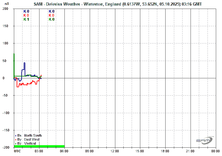 Below is the live magnetometer trend from the sensors located in my back garden! When a geomagnetic storm starts - the magnetometer responds with spikes indicating unrest. As the storm strengthens the magnetometer spikes better... once the trend falls significantly in these lower latitudes there is a chance that we will see the aurora low in the Northern Horizon... don't forget, clear skies and no light pollution is required for best results... Good Luck!!!